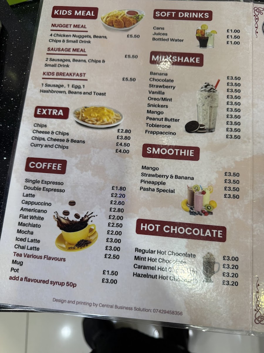 At Pasha Cafe, the menu is a delightful mix of flavorful dishes that cater to all ages and preferences. For families, the kids' meals, including the crispy nugget meal and the hearty sausage meal, are available for just £5.00, ensuring that even the youngest diners are well satisfied. The café is also known for its scrumptious chicken shish and chicken tikka, both priced at £8.00, expertly grilled and bursting with flavor, perfect for those looking to indulge in something hearty while maintaining a healthy lifestyle.